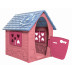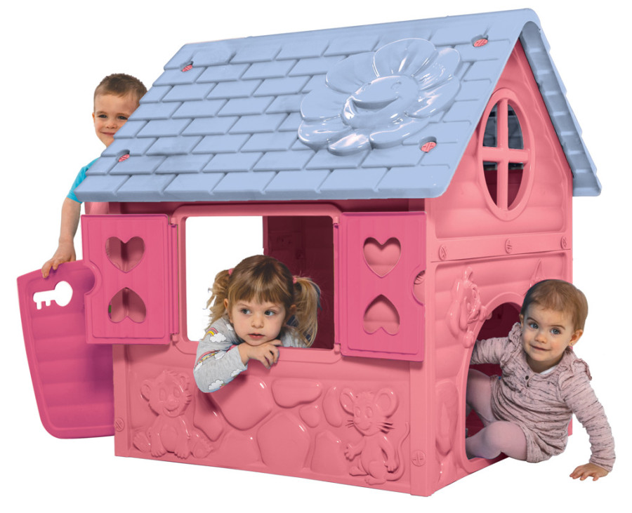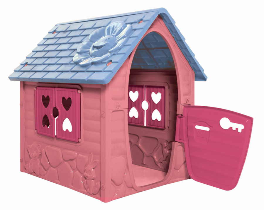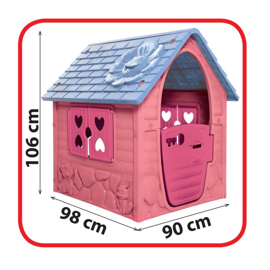 Dětský plastový domeček s kytičkou v růžové barvě s okny a modrou střechou. Domeček má velmi jednoduché sestavení. Na domečku je jedno otevírací okno, otevírací dveře. Pro svoji velikost je vhodný pro venkovní i vnitřní užití.