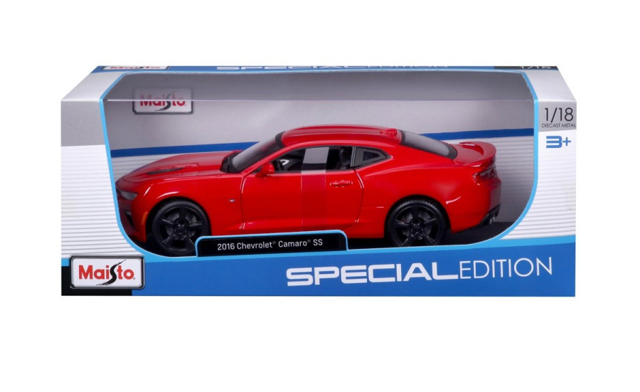 Kovový model auta Chevrolet Camaro SS v měřítku 1:18 značky Maisto. Model má detailní zpracování karoserie včetně interiéru automobilu.