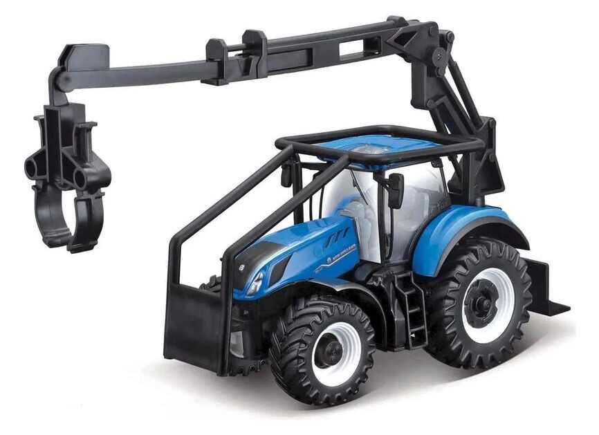 Kovový model ze serie Bburago Farm Traktor New Holland T7.315 HD - lesní traktor. Traktor má délku 10 cm bez příslušenství a 13 cm s příslušenstvím. Součásti balení jsou i tři platové klády dlouhé 12,5 cm.
