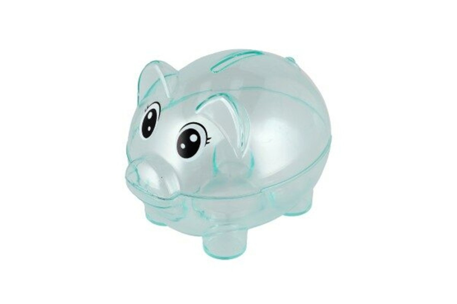 Průhledná plastová pokladnička prasátko modré, 11x9cm