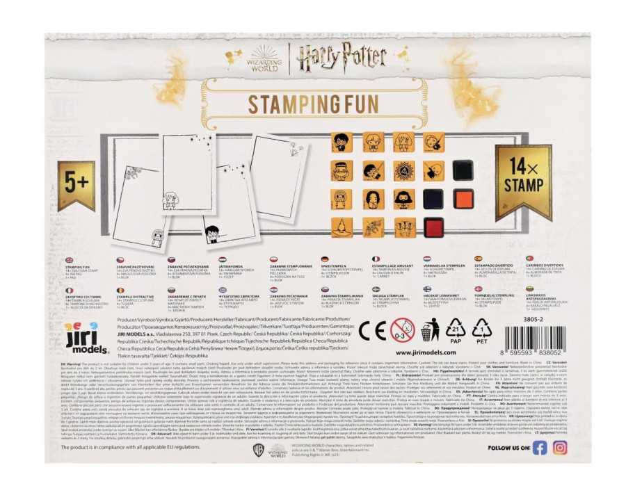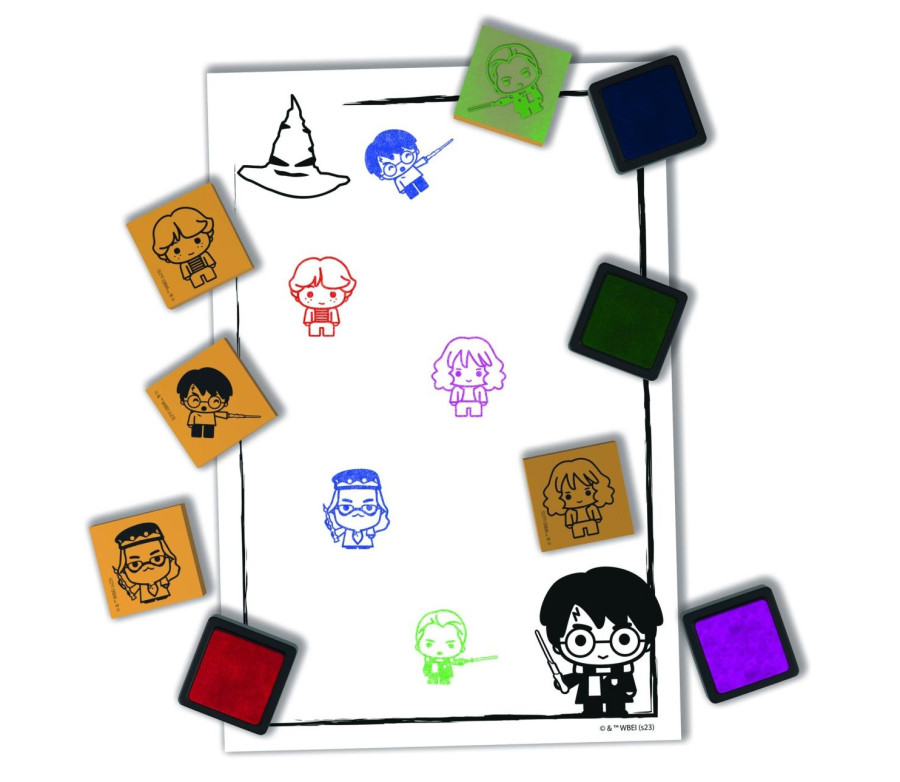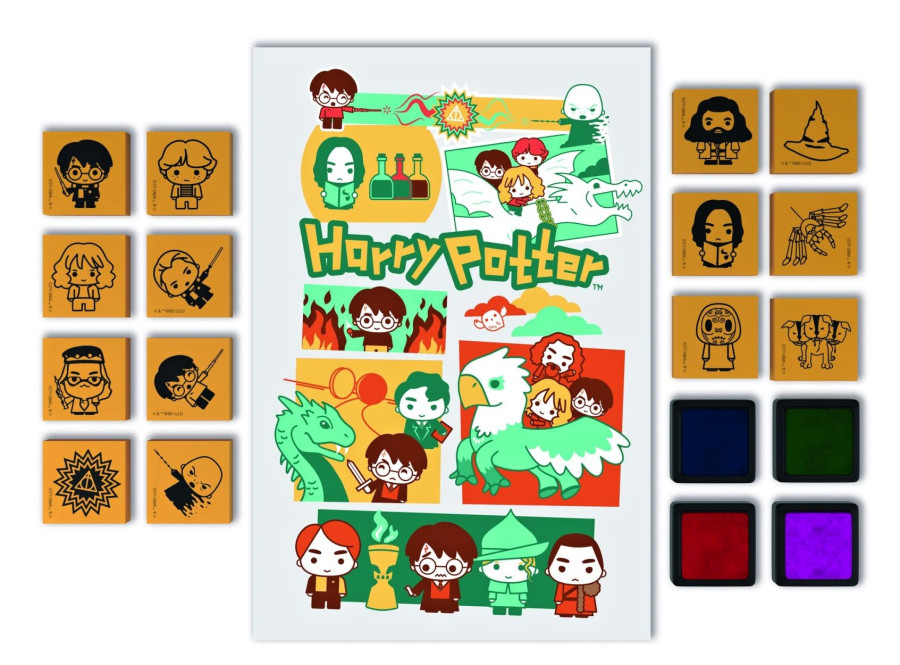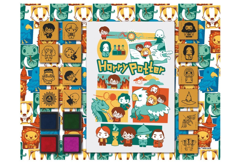 Kreativní sada pro milovníky Harryho Pottera. Set obsahuje 14 pěnových razítek, 4 barevné podušky a blok plný zábavných aktivit k luštění a vyplnění. Vhodné pro děti od 3 let.Rozměr balení: 29x23x2,5cm.