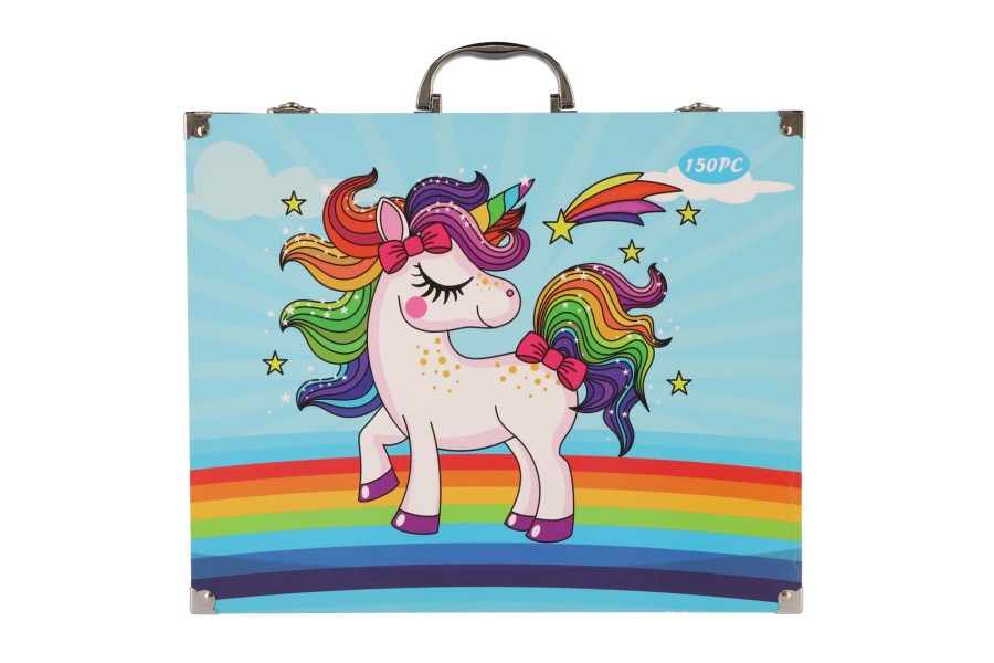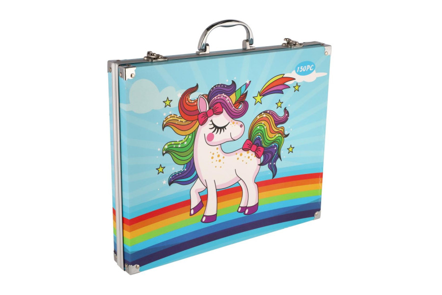 Probuďte svou kreativitu! Tento set obsahuje 150 různých pomůcek v praktickém kufříku s motivem jednorožce . Perfektní pro malování, kreslení a další umělecké aktivity. Ideální pro děti i dospělé.