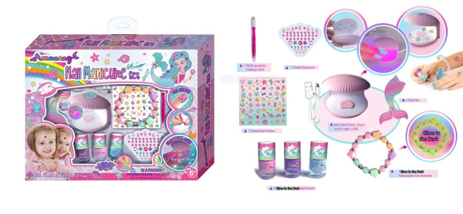 Nádherná sada nehtového studia, která obsahuje 3 slupovací laky na nehty, ozdobné kamínky, nálepky, ve tmě svítící náramek a uv lampu v krásném balení. K lampě je v balení součástí usb kabel, nevyžaduje baterie, pouze zdroj napájení.