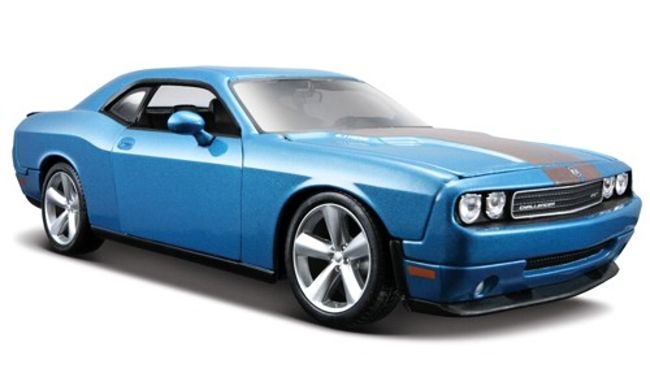 Kovový model auta Dodge Challenger moderé barvy v měřítku 1 : 24 značky Maisto. který má otvíratelnou přední kapotu motoru, otvíratelné dveřeí.
