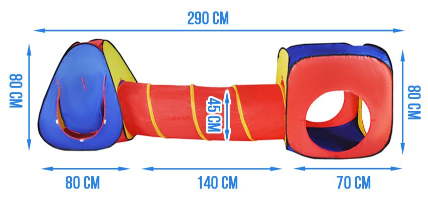 Dětský stanový set se skládá z jehlového stanu, roztahovacího tunelu a čtvercového stanu. Sestava sestava má po složení max. délku 290 cm.