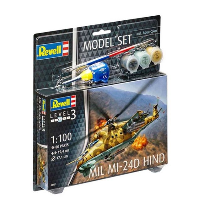 Revell ModelSet vrtulník 64951 Mil Mi-24D Hind je plastová stavebnnice určena ke slepení v měřítku 1 : 100. Stavebnice obsahuje 80 dílků lepidlo, štětec a barvičky 362, 49, 16 (5 ml). Model má po sestavení délku cca. 19,4 cm.