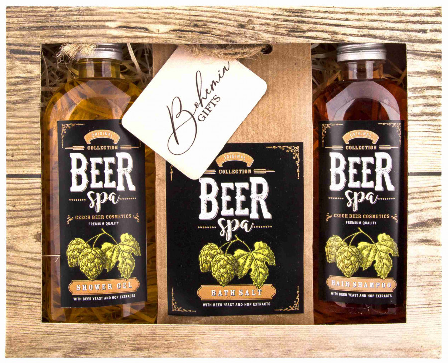 Pivní dárková sada sprchový gel 100 ml., koupelová sůl 150 g a vlasový šampon 100 ml. (Beer Spa) obsahující výtažky z pivních kvasnic a chmele vyrobený novou recepturou má příznivé účinky na pokožku a vlasy.