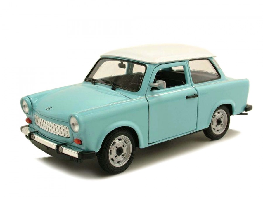 Kovový model auta Trabant 601 v měřítku 1:24 značky Welly. Model má detailní zpracování karoserie včetně interiéru automobilu. Na modelu se otvírají dveře a kapota motoru.