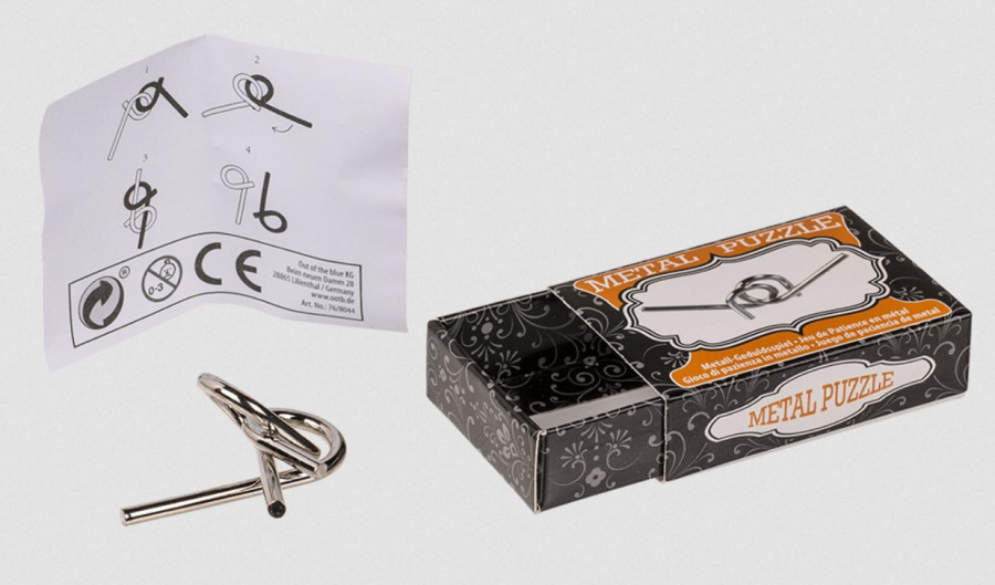 Kovový hlavolam cívka v retro krabičce má středně těžkou obtížnost a jeho balení obsahuje návod jak odělit od sebe jeho části bez použití násilí.