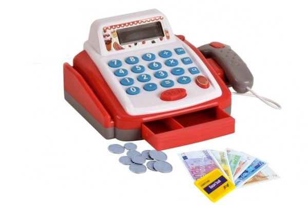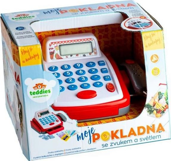 Dětská malá digitální pokladna s doplňky pro každý správný obchod. Pokladna má funkční kalkulačku s displejem, otevírací zásuvkou s penězi a světlem a zvukem u čtečky čárových kódů.