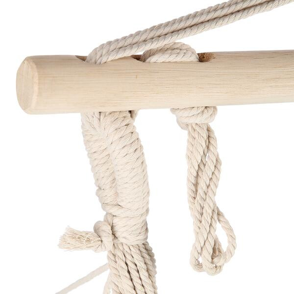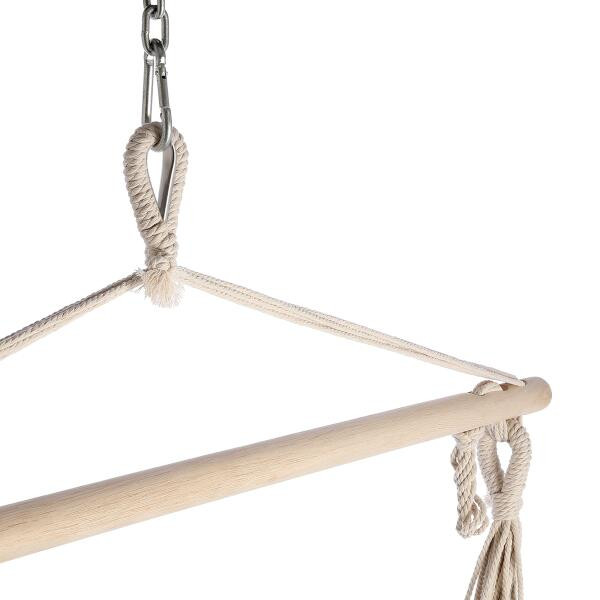 Lana prochází přes dřevěnou příčku a sbíhají se do závěsného oka. Křeslo stačí vybalit, zavěsit kamkoliv do vhodné výšky a už můžete odpočívat například při čtení oblíbené knihy. Použité materiály zajišťují nejen prodyšnost a pohodlnost křesla, ale také jeho dlouhou životnost a odolnost.