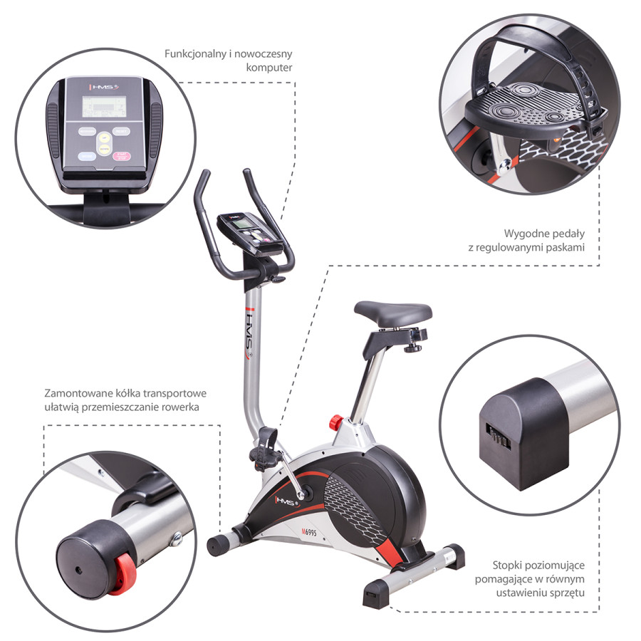 Magnetický rotoped HMS Premium M6995 je ideálním nástrojem pro osobní kardio trénink v domácím prostředí. Počítač modelu M6995 je vybaven přehledným displejem, který zobrazuje veškeré důležité údaje pro přehledný trénink. Dominantou je matice, která zobrazuje průběh aktuálně zvoleného programu rozděleného do 16-ti časových úseků. Každý sloupeček znázorňuje zvolenou zátěž aktuálního úseku. Kolem matice se nachází jedotlivé údaje: čas tréninku, aktuální rychlost / počet otáček, vzdálenost, výkon / spálené kalorie a tepová frekvence. Pod displejem nalezneme kolejničku pro odložení mobilního zařízení a tlačítka pro obsluhu počítače. Zvolit si můžeme vždy jeden z 23 programů, jde o 12 vestavěných, 4 uživatelsky definované programy a dále o celkem 7 programů pro WATT, H.R.C a Recovery. Brzdný systém modelu M6995 se skládá z 8-mi kilogramového, zátěžového kola a z automaticky regulované, magnetické brzdy. Toto řešení je tiché, bezúdržbové a díky automatické regulaci má trenažér 16 stupňů zátěže. Tento rozsah umožňuje téměř plynulé nastavení zátěže.. Konstrukce modelu M6995 je vyrobena ze solidní oceli, díky které je nosnost trenažéru až 120 kilogramů. Řídítka s elektrodami pro snímání srdečního tepu, je možné naklápět. Sedlo je polohovatelné vertikálně do 9-ti poloh a v horizontální rovině je umístěno na kolejnici pro plynulý posun. Vzdálenost středu sedla od pedálů tak jde nastavit v rozsahu 66 - 92 centimetrů. Přední stabilizátor je vybaven kolečky pro snadné přesouvání. Zadní stabilizátor zase nabízí výškově nastavitelné podložky pro vyrovnání trenažéru do roviny.